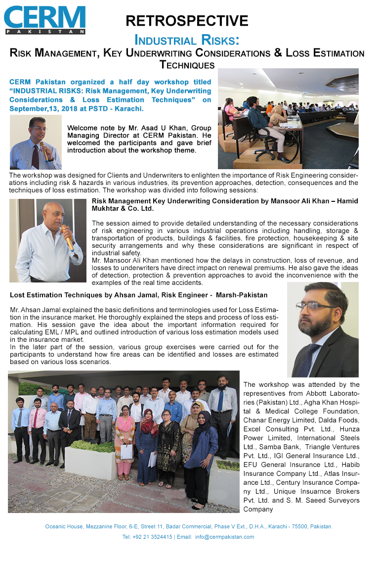 | 4 | Industrial Risk Workshop: Risk Management, Key underwriting consideration & loss estimation techniques. | 13 September 2018 |